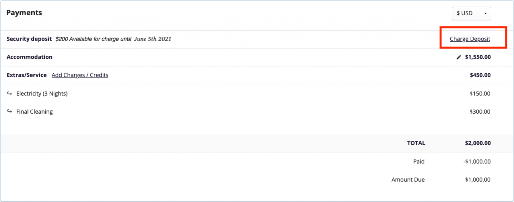 Assuming the guest pays via credit card, the system will automatically withhold a security deposit the day before check-in.