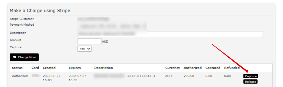 To charge a security deposit, select the capture button. From here you can choose the amount required for repairs. Or you can capture the full amount and refund the remainder once you know how much repairs will cost. The reason for doing this is you may lose the hold on the deposit. REMEMBER: You will also be charged a cc fee when you capture the amount, so you may want to take this into account when you work out how much you are capturing (i.e. if you're claiming $100, you may want to claim $103.50 to account for the credit card charge you would incur to ensure your net amount received is $100).