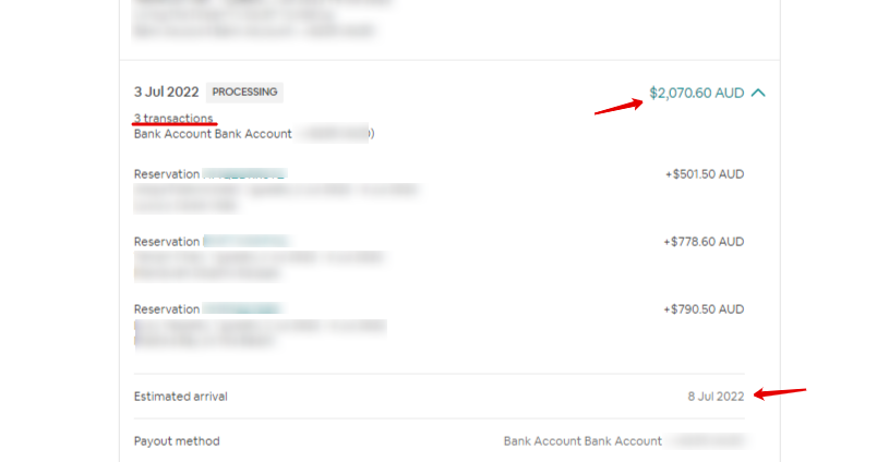 From here, you can scroll down and see each payout amount - these should match up with the "DIRECT CREDIT Payoneer Austral" transactions on your CSV File. If a payout holds multiple bookings it will say "x transactions" under the date. Select the drop down arrow on the right to show how much each booking payed out.
