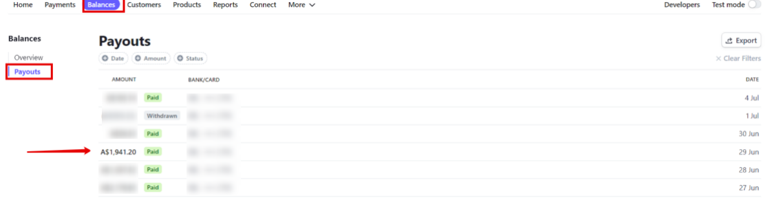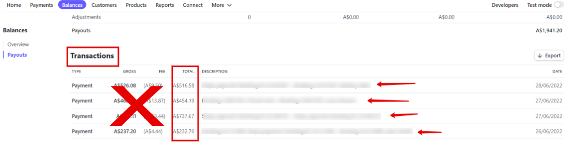 Log into Stripe to confirm payout details (Balances > Payouts). Stripe payouts may consist of multiple payments for different bookings appearing as one payout item on your bank statement, so you will need to break them down into individual payouts within the CSV file.