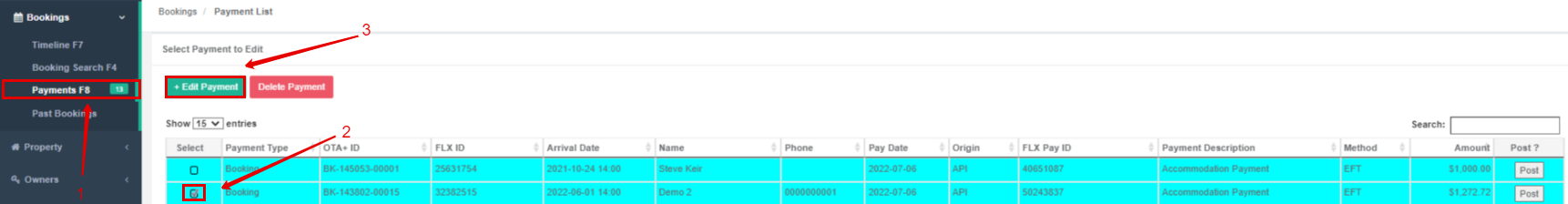 Post transactions in OTA+ by going into Bookings > Payments (Or press F8). Copy and paste the guest name or booking number from your bank statement csv file into the search bar immediately above the payments on the right hand side to locate the relevant payment. Click anywhere inside the row pertaining to that payment (except for the Post button - do not click on this yet) to ensure that payment has been selected and there is a tick in the box on the left hand side for that payment and select "+ Edit Payment".