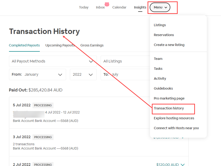 First log into Airbnb > Switch to hosting > Menu > Transaction History
