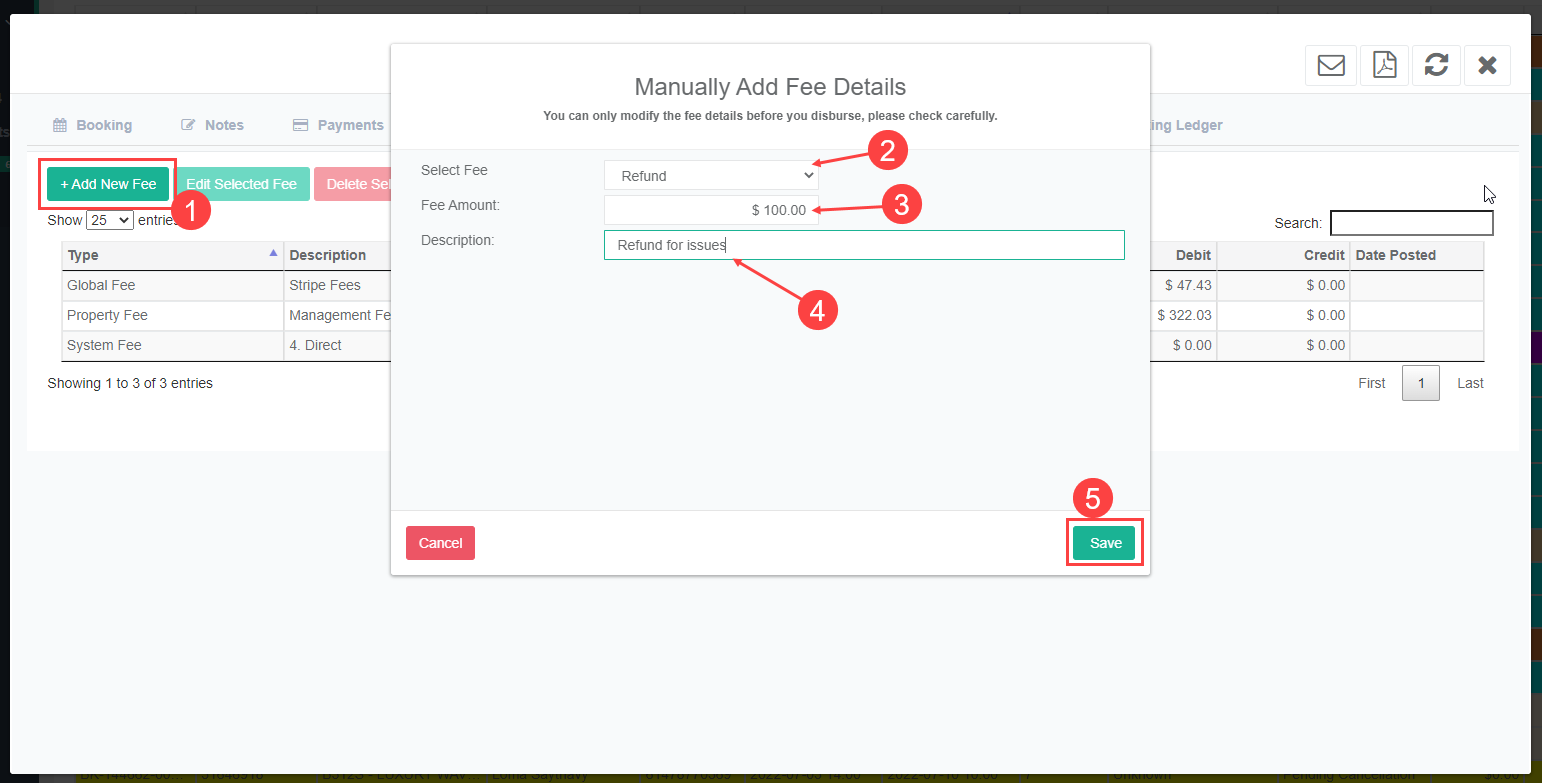Go to the 'Fees' tab of the booking and click on the '+ Add New Fee' button, then the 'Yes, Add New Fee' button. In the pop-up screen, choose the 'Refund' or 'Guest Refund' option in the Select Fee setting, enter the refund amount, enter a description, then click on Save and then 'Yes, Save Fee Changes':