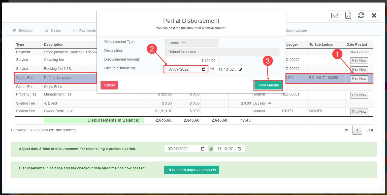 There will be a number of different disbursement options. You will need to edit the guest refund disbursement to be the amount refunded to the guest. If the guest wasn't refunded in full, you will need to decide what to do with the remaining funds in the booking ledger. Funds can be sent to the property manager via the Management Cancellation Fee and to the owner via the Property Owner Cancellation Fee. The total disbursements must match the net amount posted to the booking ledger. Make sure you select the date that the refund to the guest that you are trying to post came out of the trust account as the disbursement date and then disburse the cancellation.