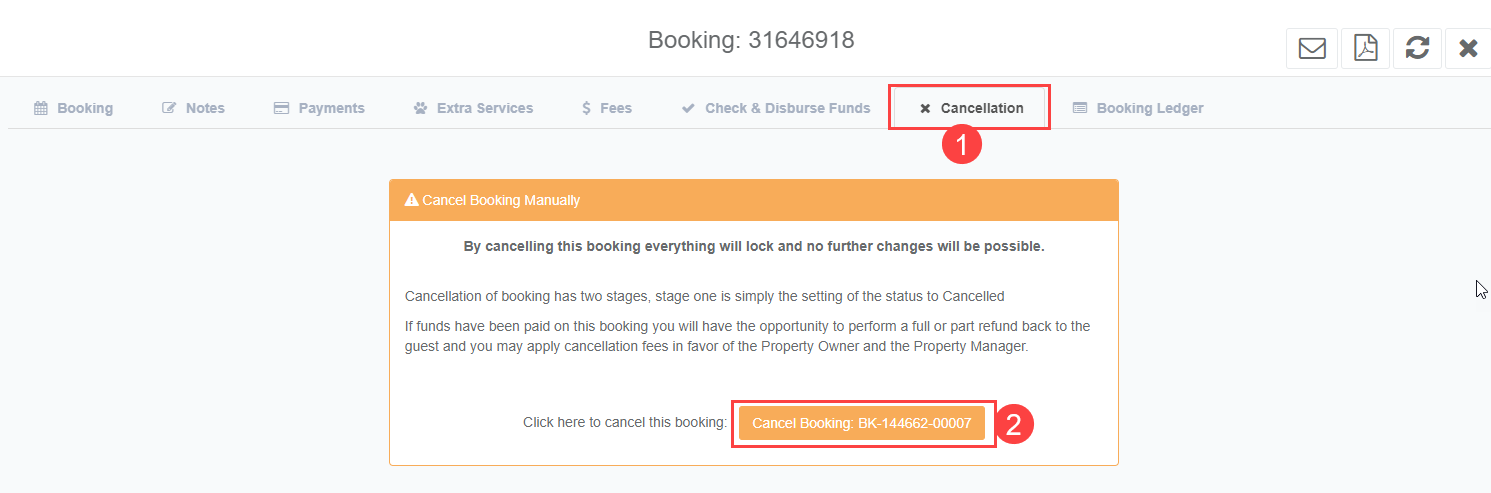 Click on the Cancel booking button and in the pop-up window select 'Yes, Cancel This Booking' and then 'Proceed with Disbursements'.
